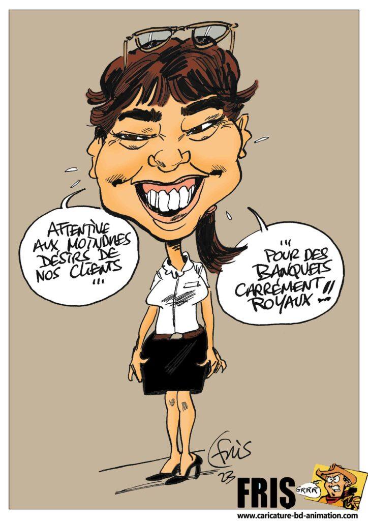 Quand Fris travaille d’après photo pour un événement — par exemple lors d’un dîner professionnel où chaque invité découvre sa caricature sous plexiglass à sa place — il ne cherche pas la photographie exacte. Il cherche le caractère. La mâchoire volontaire. Le regard malicieux. La posture assurée. Résultat : on se reconnaît. Et on sourit.