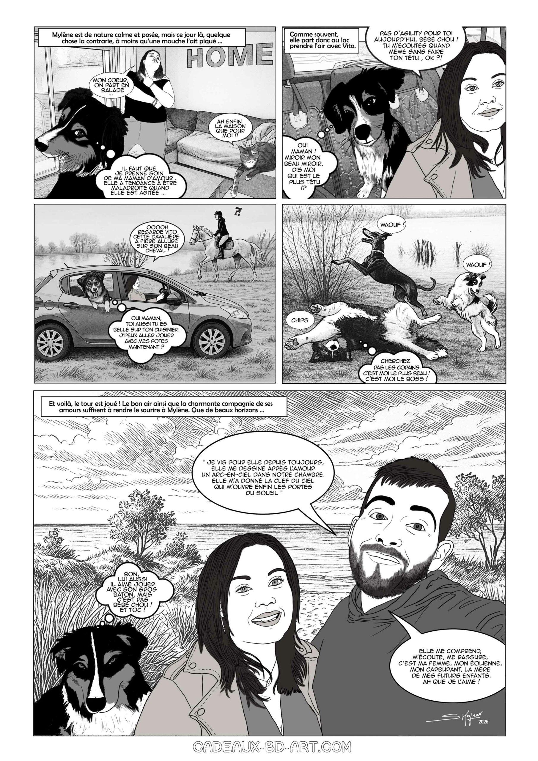 Je cherchais depuis quelques mois une personne prête à realiser une BD personnalisée, et en tombant par hasard sur le site, j’ai immédiatement été charmée par ce que j’ai vu! C’était exactement ce que je cherchais depuis longtemps! Alors, j’ai contacté Audrey et sa team et, ensemble, nous avons pû mettre sur papier ce que j’avais en tête (j’ai été en contact avec Sylvie, aussi réactive que pro… C’est rare!). Les détails rendent l’histoire drôlement ressemblante et elle a su subtilement placer les private jokes désirées, qui, j’en suis sure, sauteront aux yeux de mon conjoint immédiatement! J’ai été ravie de la gentillesse lors des échanges et du ‘jusqu’au boutisme » de la collaboration. Je me suis sentie écoutée, et les derniers détails ont été appliqués… dans les temps! Inutile de dire que je suis aux anges à propos du rendu et que j’ai hâte de pouvoir réitérer cette expérience pour quelqu’un d’autre d’ici peu! Encore merci! Au delà du talent indéniable, c’est plus qu’agréable d’avoir à traiter avec une équipe aussi sympa! Continuez comme ca!